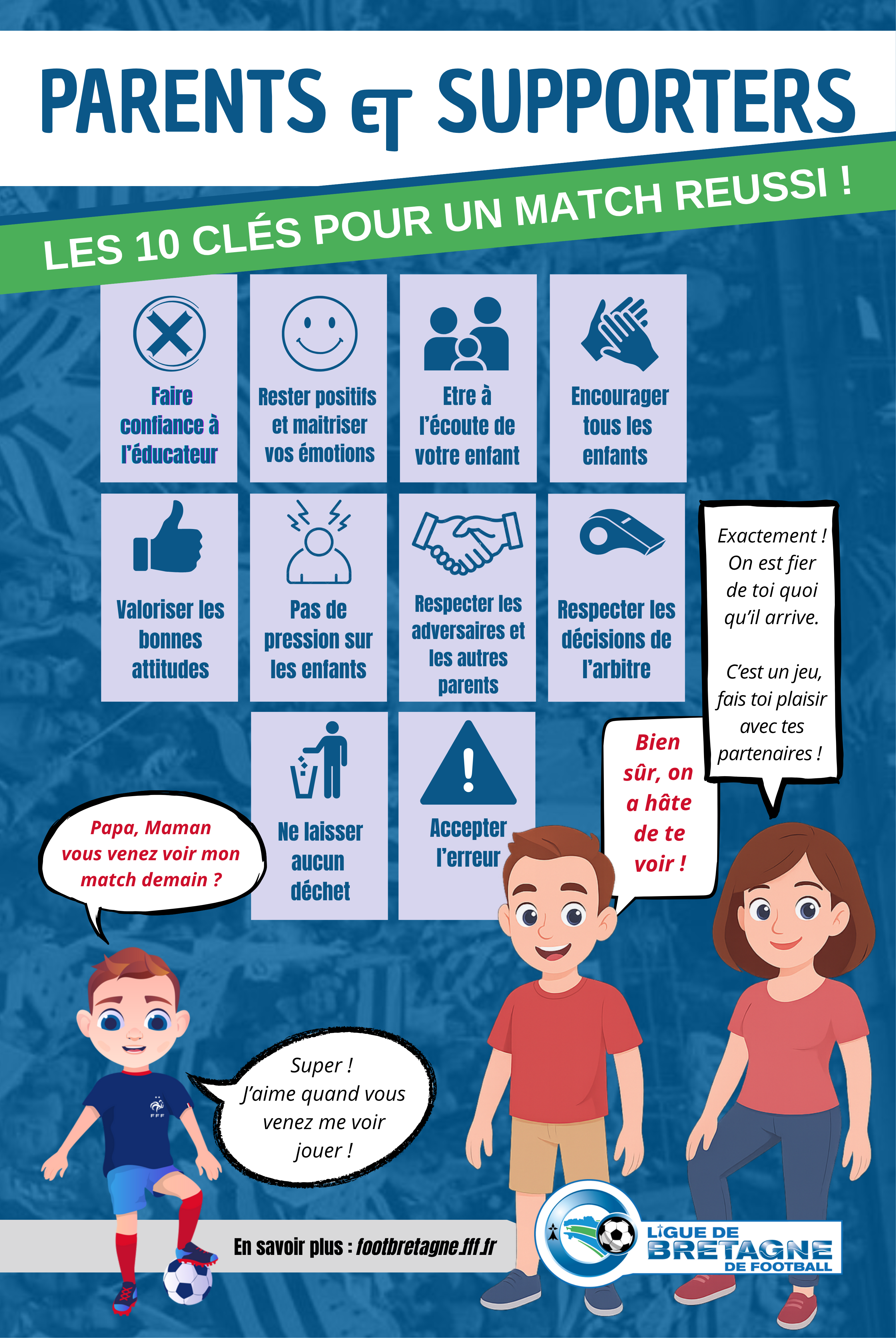 La Ligue de Bretagne de Football a mis en place une affiche intitulée « Parents et Supporters » pour sensibiliser les familles sur les bons comportements à adopter lors des rencontres de football de leurs enfants. Ce dispositif vise à rappeler le rôle essentiel des parents dans l’encadrement et le soutien positif à apporter à leurs jeunes sportifs.