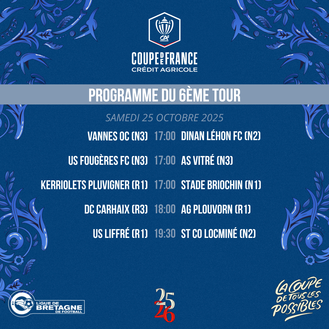 Le programme du 6ème tour de Coupe de France édition 2025-2026 qui se déroulera le week-end du 25 octobre est désormais disponible.