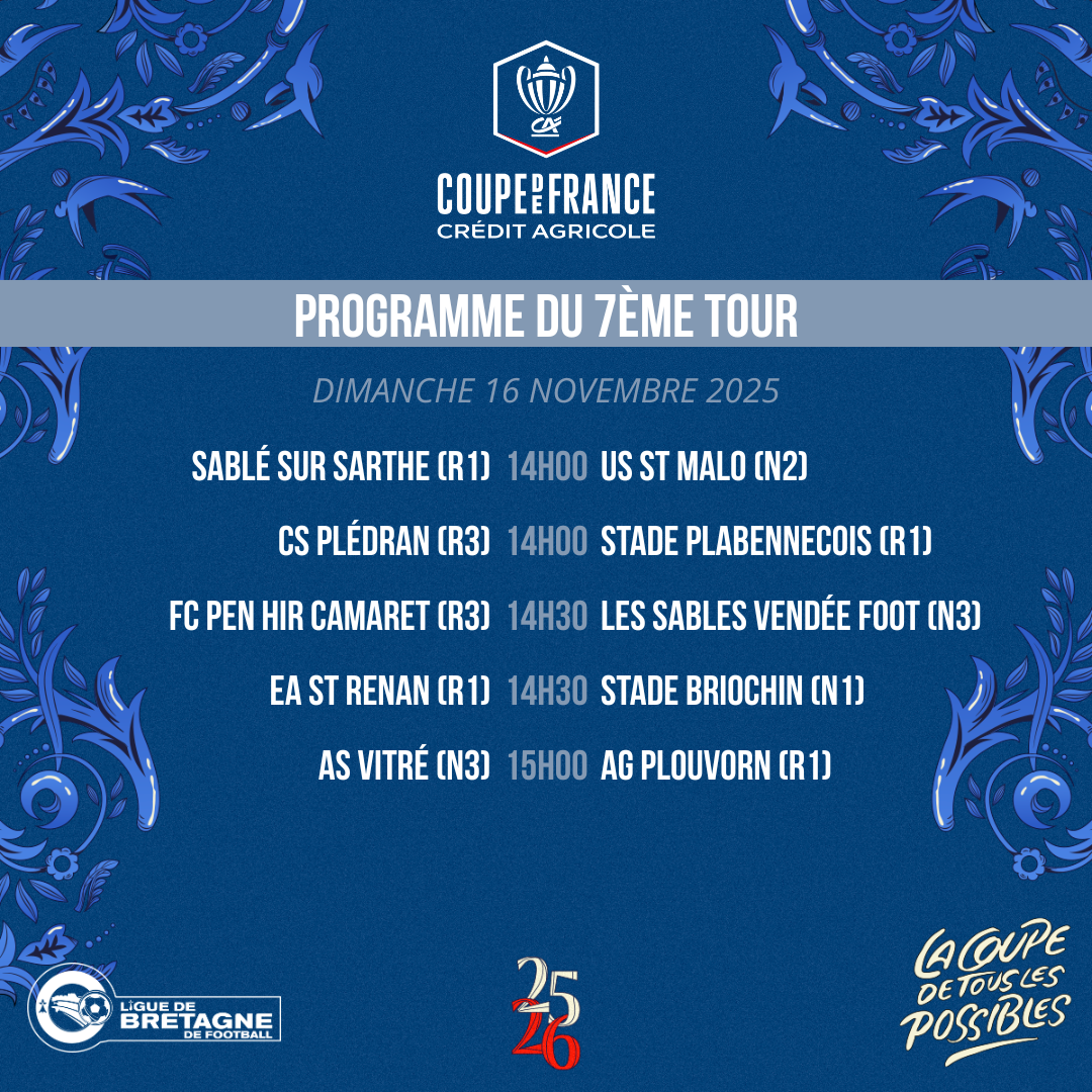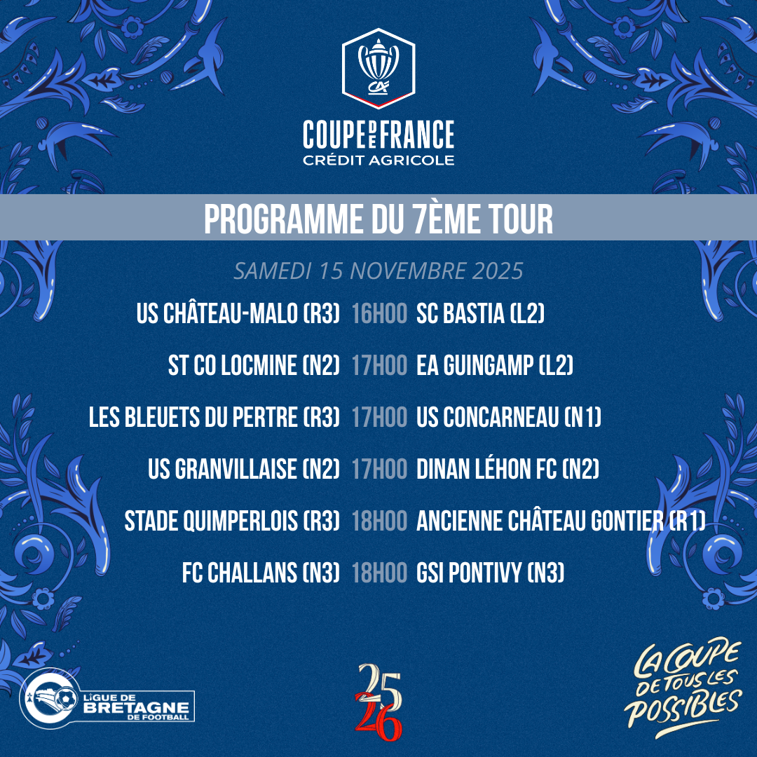 Les 15 et 16 novembre prochain, se tiendra le 7ème tour de la Coupe de France. Découvrez le programme de nos clubs bretons…