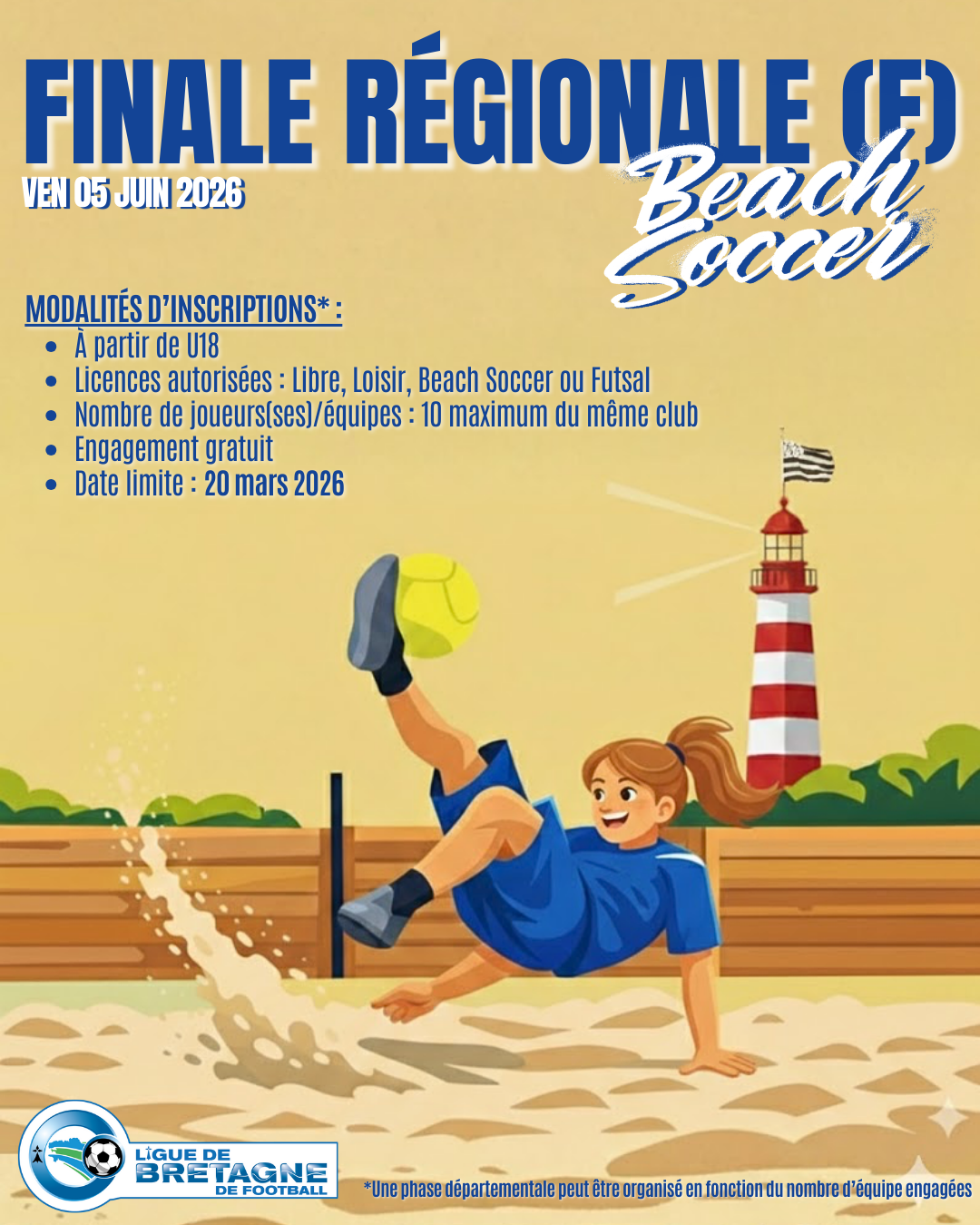 La Ligue de Bretagne de Football organise la 1ère édition de la Finale Régionale Beach Soccer le vendredi 5 juin 2026 (lieu à déterminé). Cette compétition régionale a pour ambition de promouvoir une discipline dynamique, spectaculaire et accessible à un large public licencié.