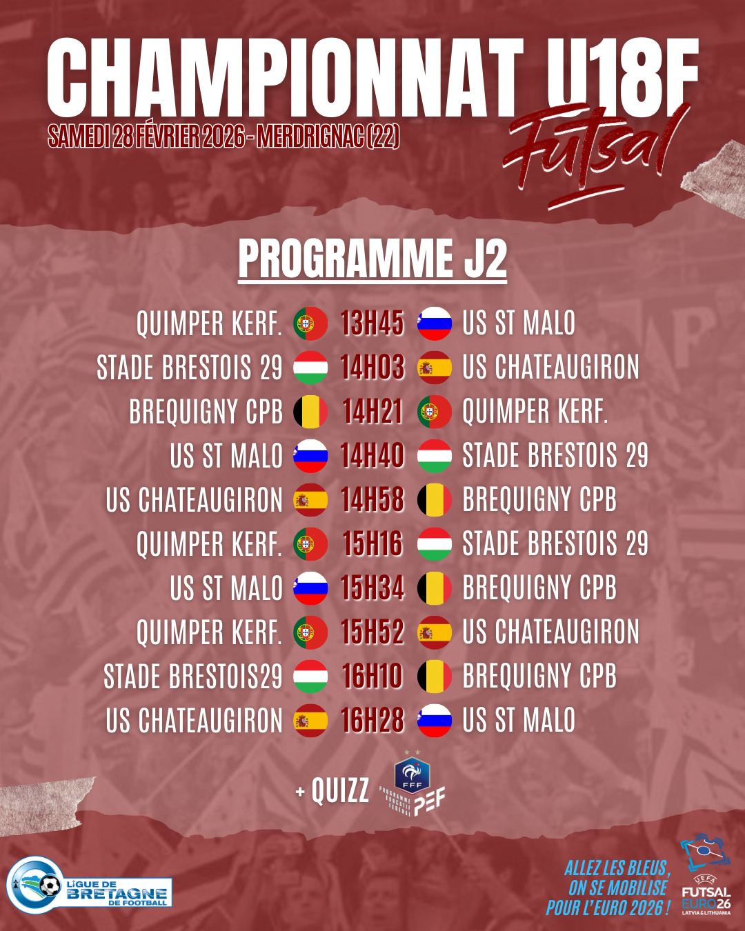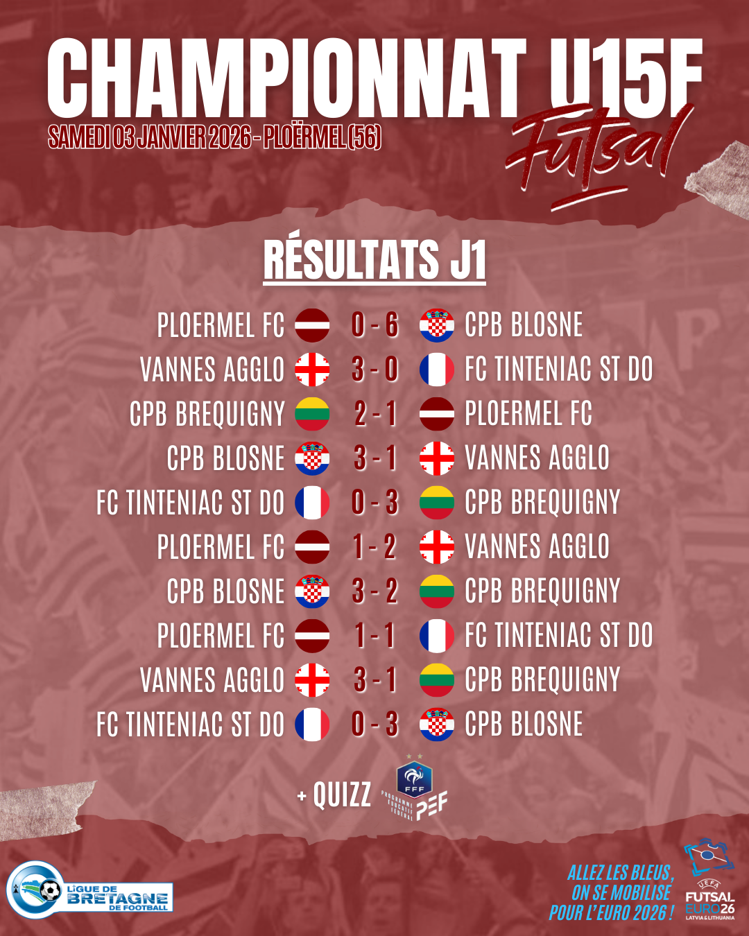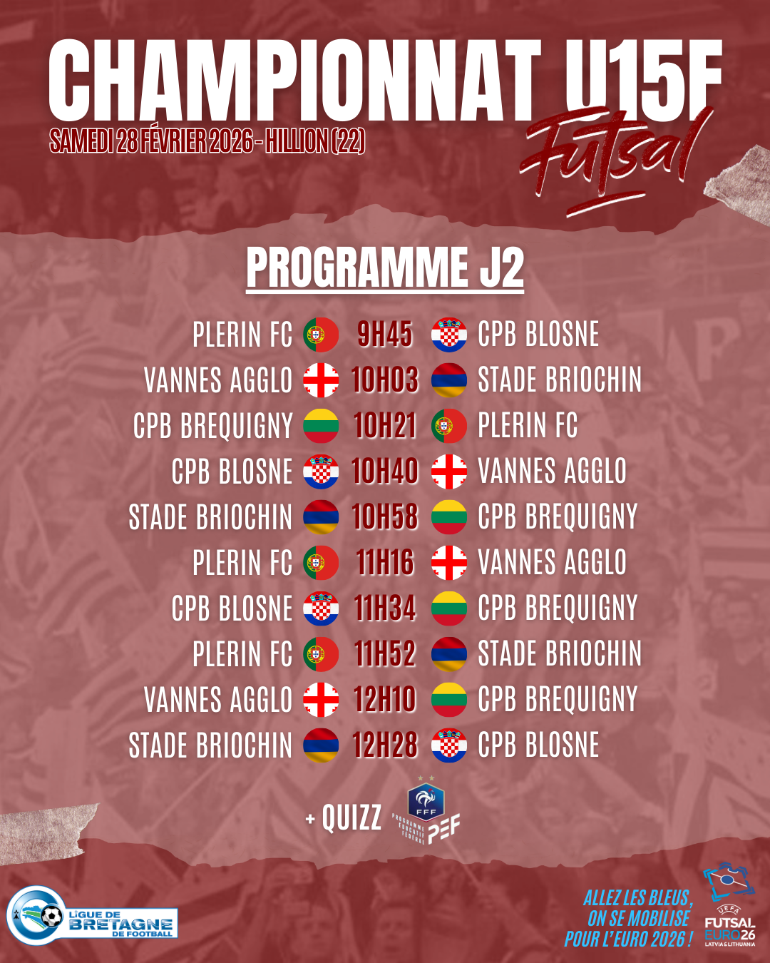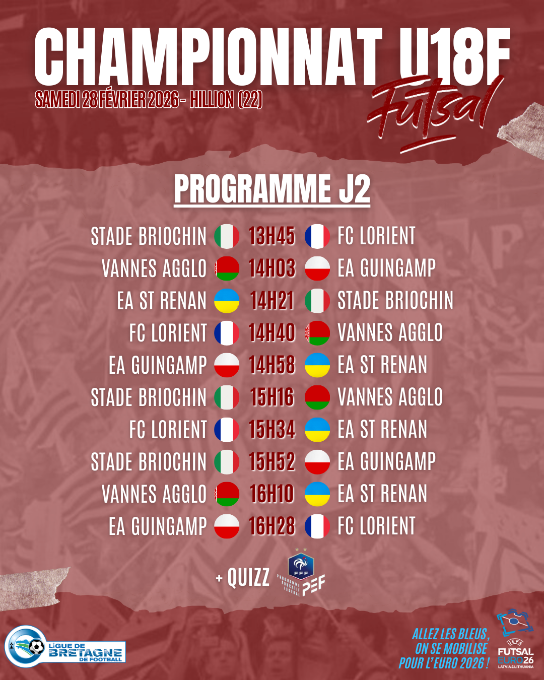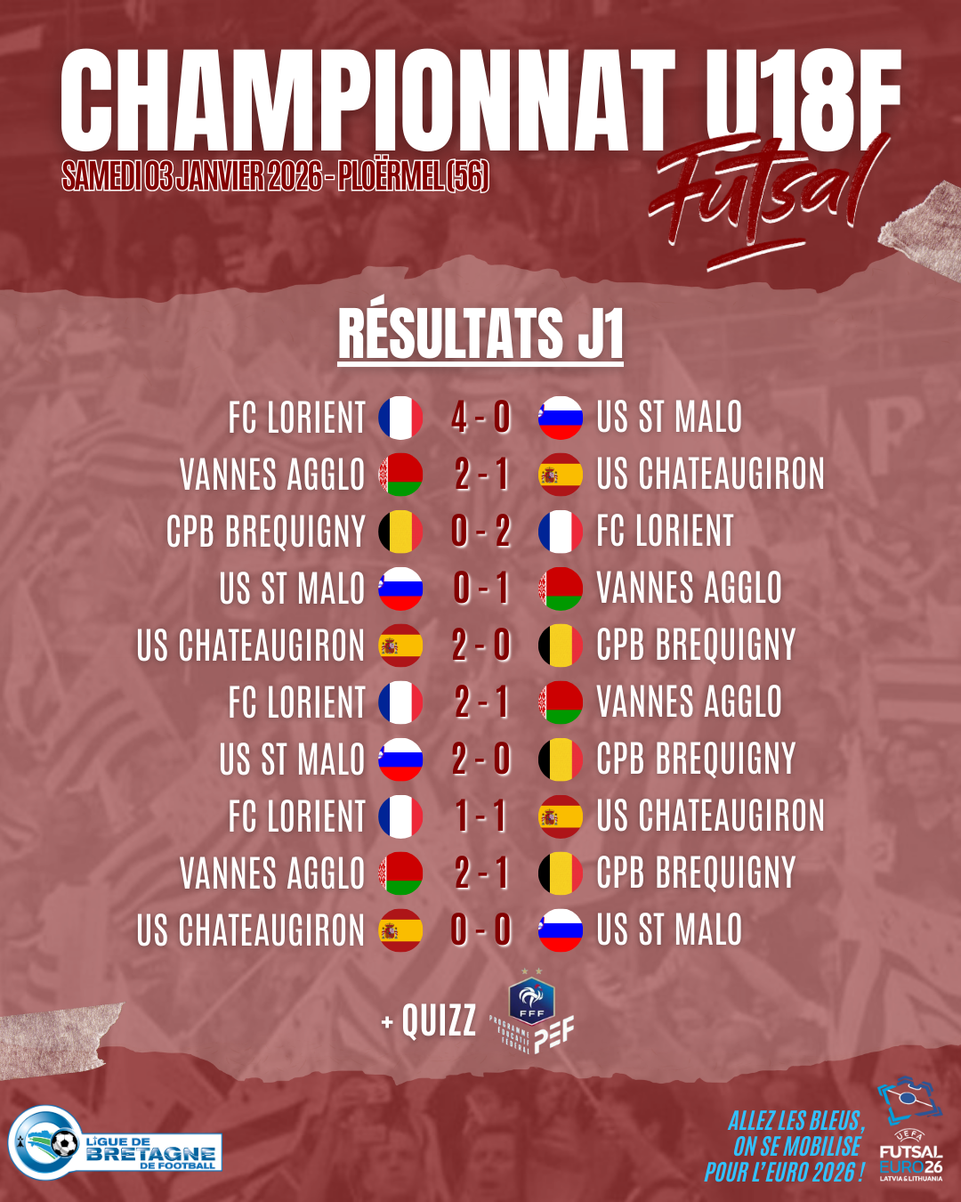 Le Challenge Régional Futsal Féminin U15 et U18 a lancé sa saison le samedi 3 janvier 2026 sur deux sites bretons : Ploërmel accueillait la Poule A tandis que Plougonven recevait la Poule B. Cette première journée a permis aux jeunes joueuses de se retrouver autour d’un futsal technique et empreint d’un bel esprit sportif aux couleurs de l’EURO FUTSAL qui va débuter ce 21 janvier 2026.