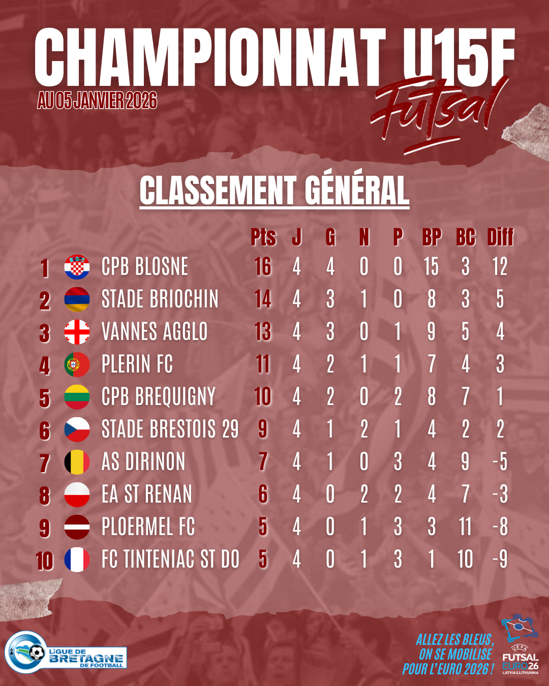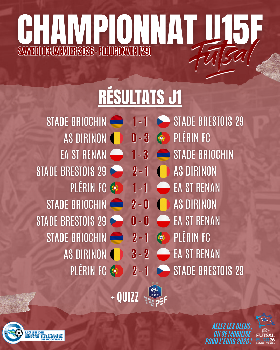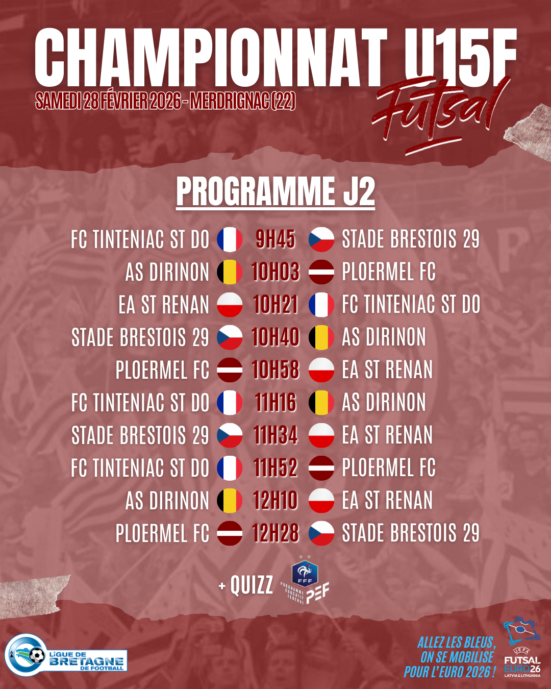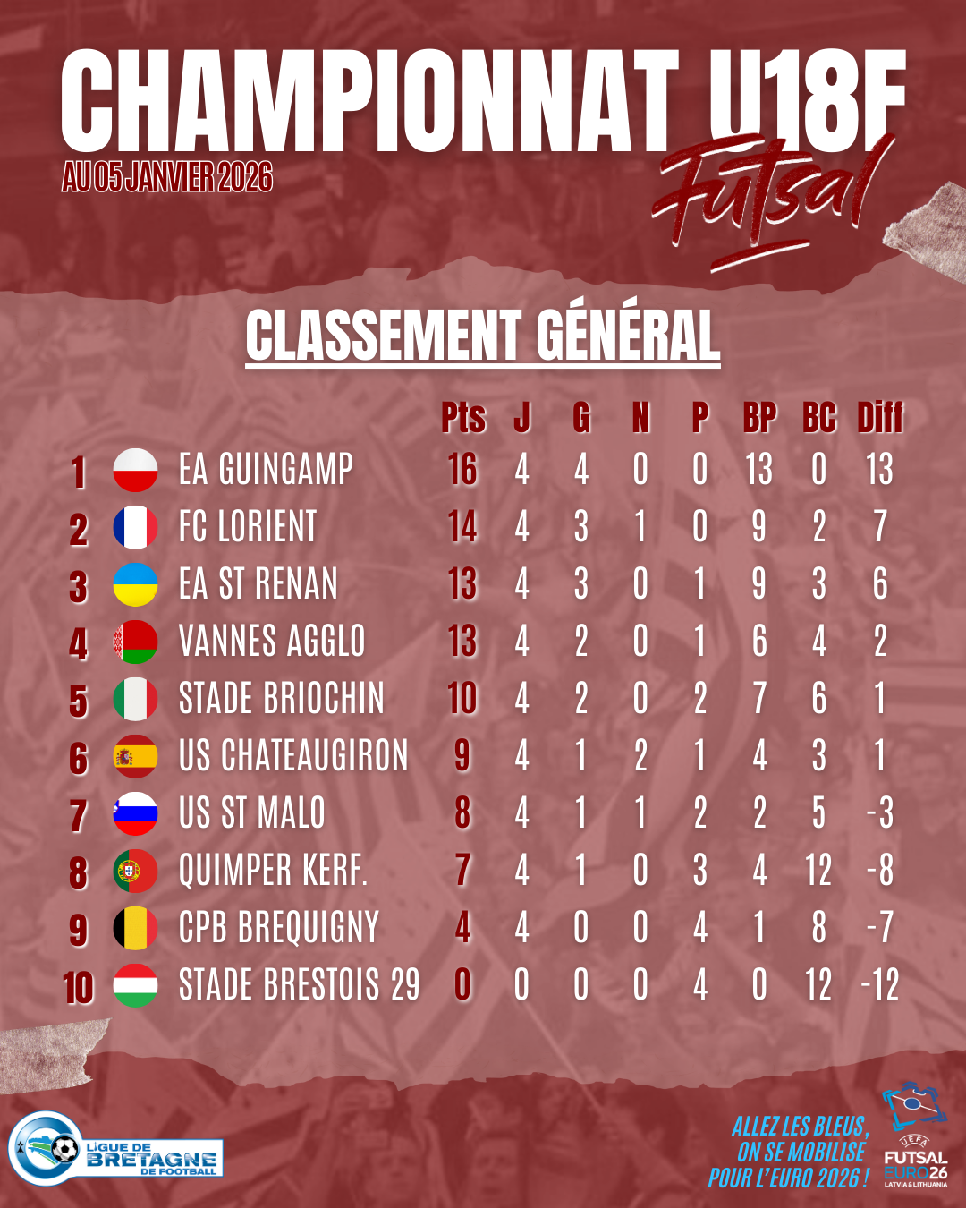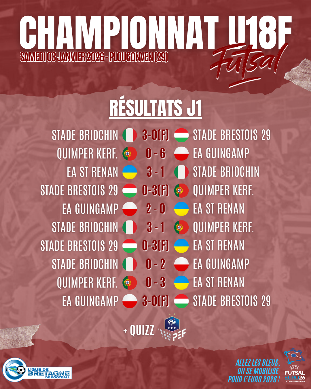 Le Challenge Régional Futsal Féminin U15 et U18 a lancé sa saison le samedi 3 janvier 2026 sur deux sites bretons : Ploërmel accueillait la Poule A tandis que Plougonven recevait la Poule B. Cette première journée a permis aux jeunes joueuses de se retrouver autour d’un futsal technique et empreint d’un bel esprit sportif aux couleurs de l’EURO FUTSAL qui va débuter ce 21 janvier 2026.