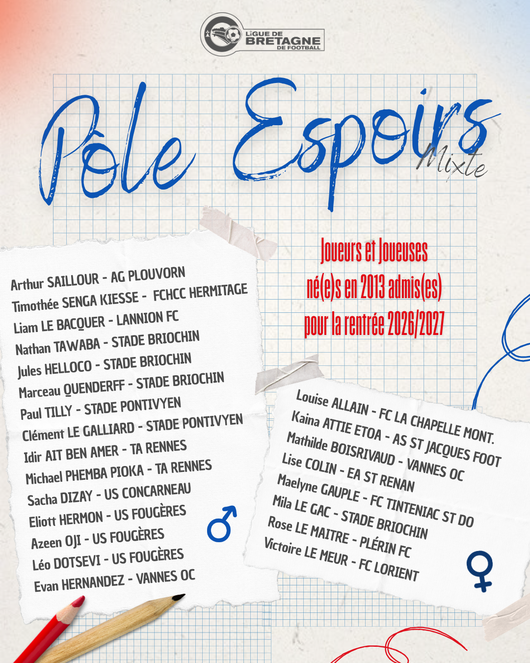 Suite au stage probatoire qui s’est déroulé le week-end dernier, découvrez la liste des joueurs et joueuses né(e)s en 2013 admis(es) au Pôle Espoirs Mixte de Ploufragan pour la rentrée 2026-2027.
